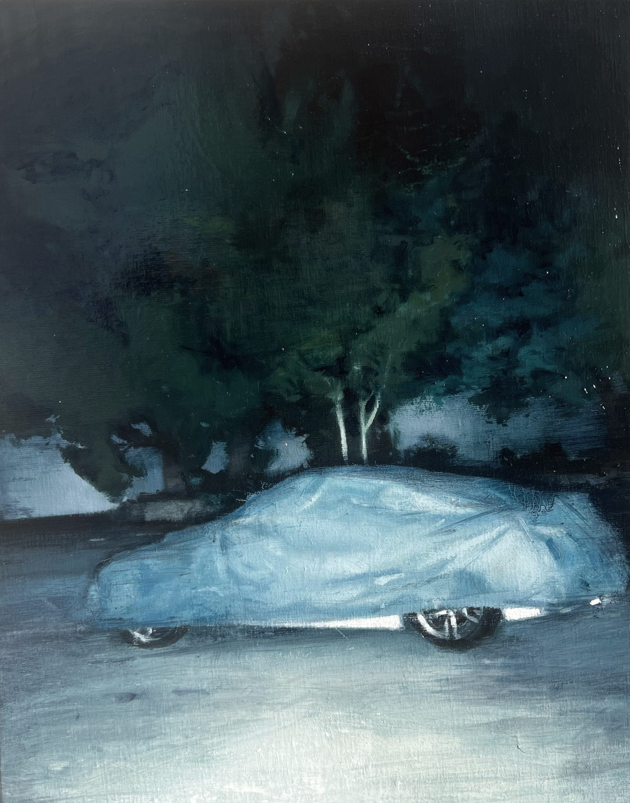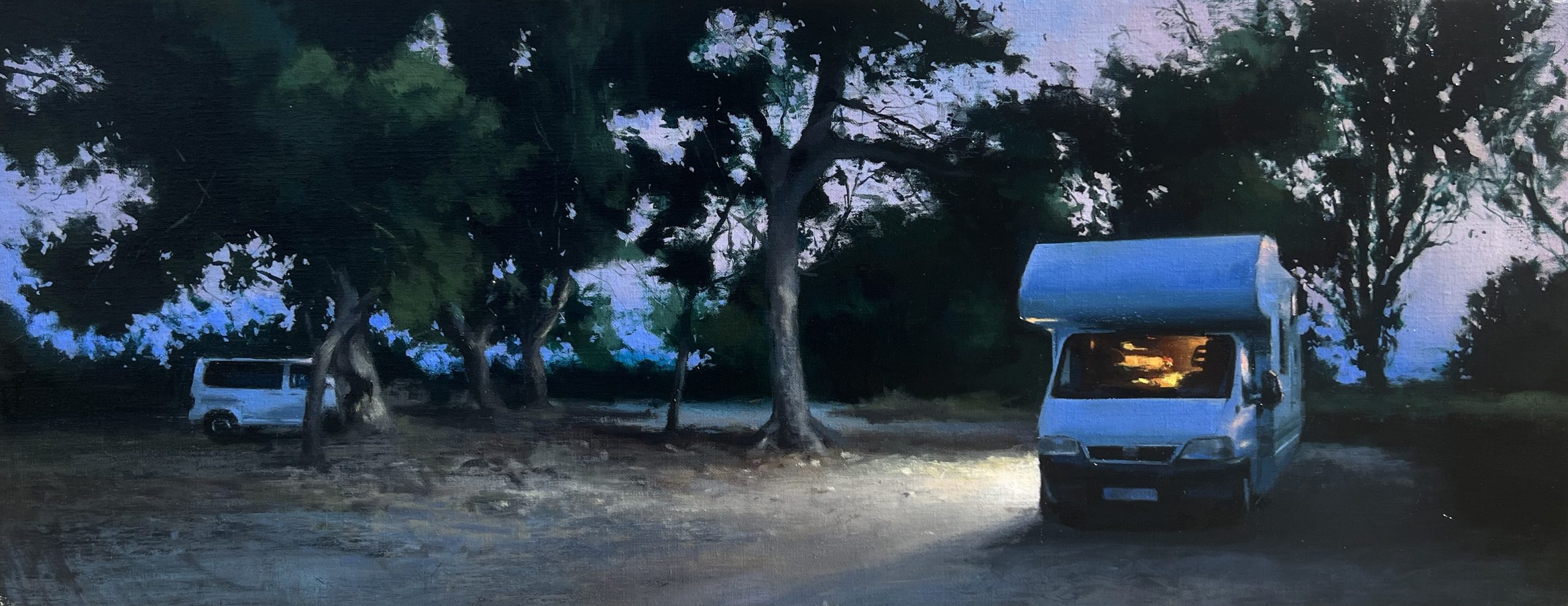 Diego Vallejo-García (Ávila, 1991) nos transporta a atmósferas tremendamente contemporáneas, podríamos denominarlas “naturalezas atmosféricas”; el ser humano está de paso, no es protagonista; los elementos no siempre son naturales y sin embargo son nuestro principal hábitat. En sus cuadros siempre esperamos que sucedan cosas por su capacidad narrativa casi cinematográfica y encuadres abiertos: quieres saber quién enciende esa luz, destapar ese coche o averiguar quién cuida esas plantas. Diego te deja participar tanto, que, como espectador, pasas a formar parte de su obra.